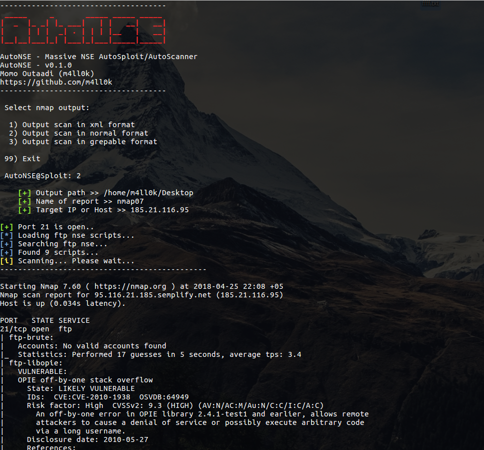 Massive NSE (Nmap Scripting Engine) AutoSploit e AutoScanner. O Nmap Motor Scripting (NSE) é um dos recursos mais poderosos e flexíveis do Nmap. Ele permite que os usuários gravem (e compartilhem) scripts simples (usando a linguagem de programação Lua) para automatizar uma ampla variedade de tarefas de rede. Esses scripts são executados em paralelo com a velocidade e a eficiência que você espera do Nmap. Os usuários podem confiar no conjunto crescente e diversificado de scripts distribuídos com o Nmap ou escrever seus próprios para atender às necessidades personalizadas. Para mais informações https://nmap.org/book/man-nse.html