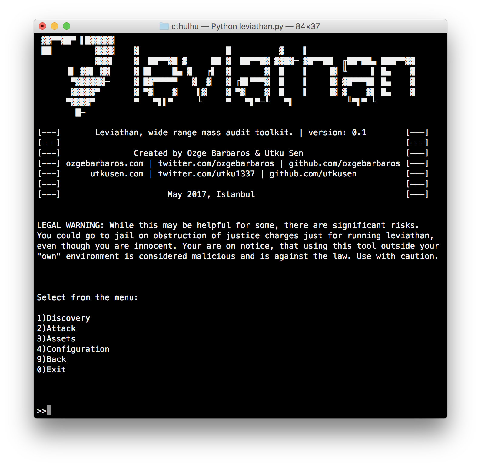 O Leviathan é um conjunto de ferramentas de auditoria em massa que possui descoberta de serviços de ampla gama, força bruta, detecção de injeção de SQL e execução de recursos de exploração personalizada. Ele consiste em ferramentas de código aberto como masscan, ncrack, dsss e lhe dá a flexibilidade de usá-los com uma combinação.