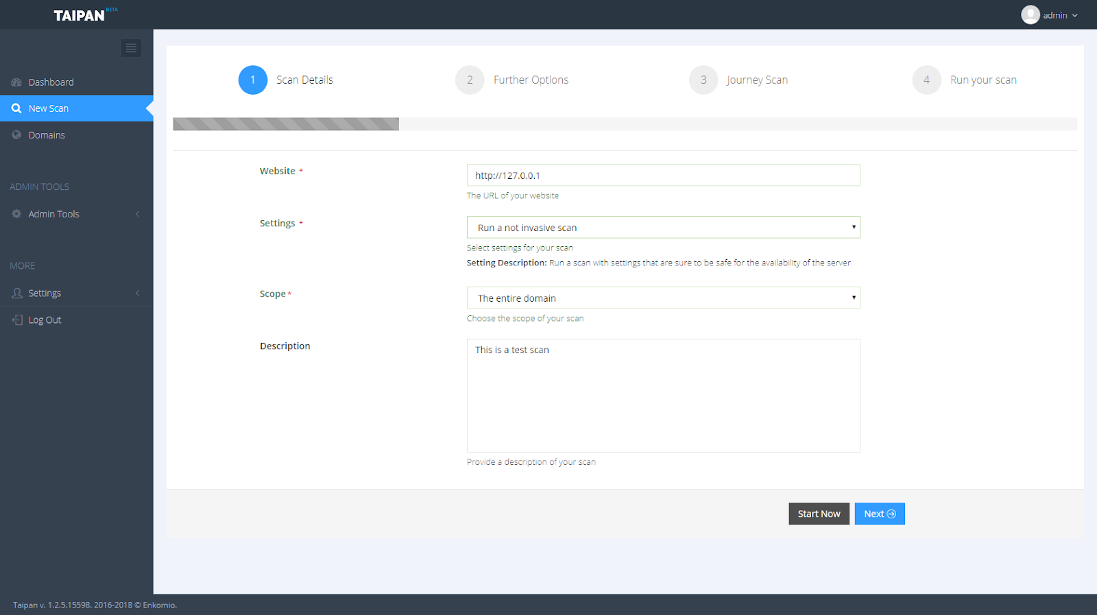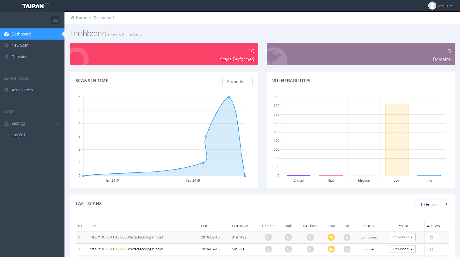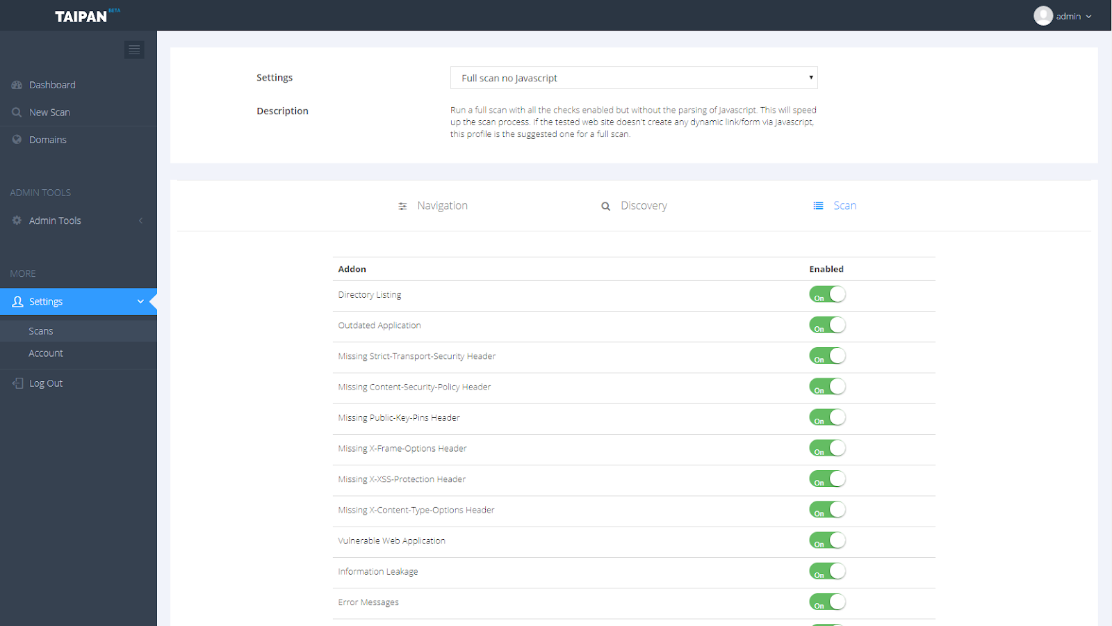 Taipan permite verificar o site fornecido especificando diferentes tipos de perfis. Cada perfil habilita ou desabilita um recurso de varredura específico, para mostrar todo o perfil disponível, apenas execute o Taipan com aopção –show-profiles .
