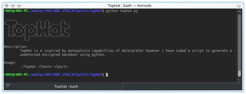 TopHat é um inspirado por metasploits capabilties de meterpreter no entanto eu tenho codificado um script para gerar um backdoor criptografado não detectado usando python. Uso: python tophat.py <local host> <local port> Download Hacking Grupo Telegram Category: Trojans